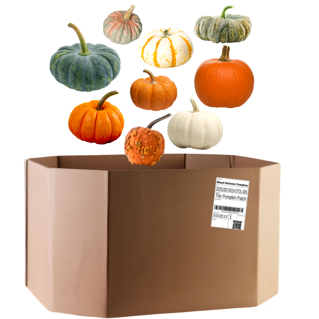 In the fall harvest season, squash and pumpkin mixed bulk bins are often displayed just outside the store. In this use case article, we will use a mixed pumpkin bin as an example to demonstrate how to maintain individual harvest yield records while creating combined products with unique and traceable labels. The workflow uses the Harvest and Packing modules.