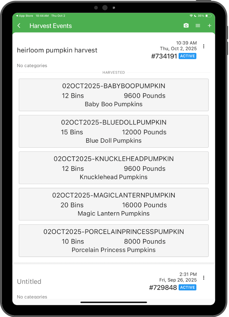 In our example harvest, the pumpkins have all been cut from the vine two weeks ago, have cured in the field, and are ready to go to retail right away. Workers in each variety section are moving pumpkins into reusable harvest containers that will be moved to a central location in the field to be combined with the other varieties. As single variety bins are filled and moved to a central location, a worker is using the Harvest module on the app to quickly log the total volume of each variety.