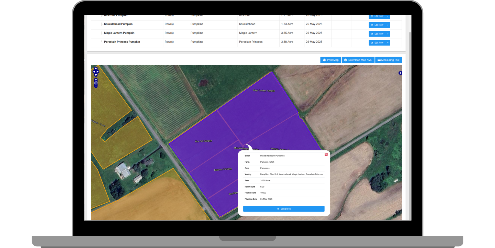 In Croptracker, setting up a mixed variety packing workflow starts with setting up the growing areas, i.e. Farms, Blocks, and Rows. The biggest component of produce traceability is maintaining a record of the origin growing area, and Croptracker support staff make sure to help users structure their growing regions to best support their harvest and packing workflows. The following example is set up to support a scenario where several different varieties of pumpkins are taken from the field and packed together by hand.