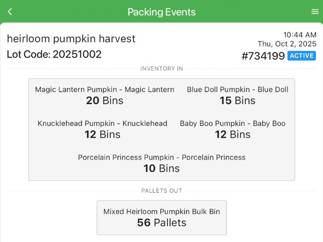 In the fall harvest season, squash and pumpkin mixed bulk bins are often displayed just outside the store. In this use case article, we will use a mixed pumpkin bin as an example to demonstrate how to maintain individual harvest yield records while creating combined products with unique and traceable labels. The workflow uses the Harvest and Packing modules.