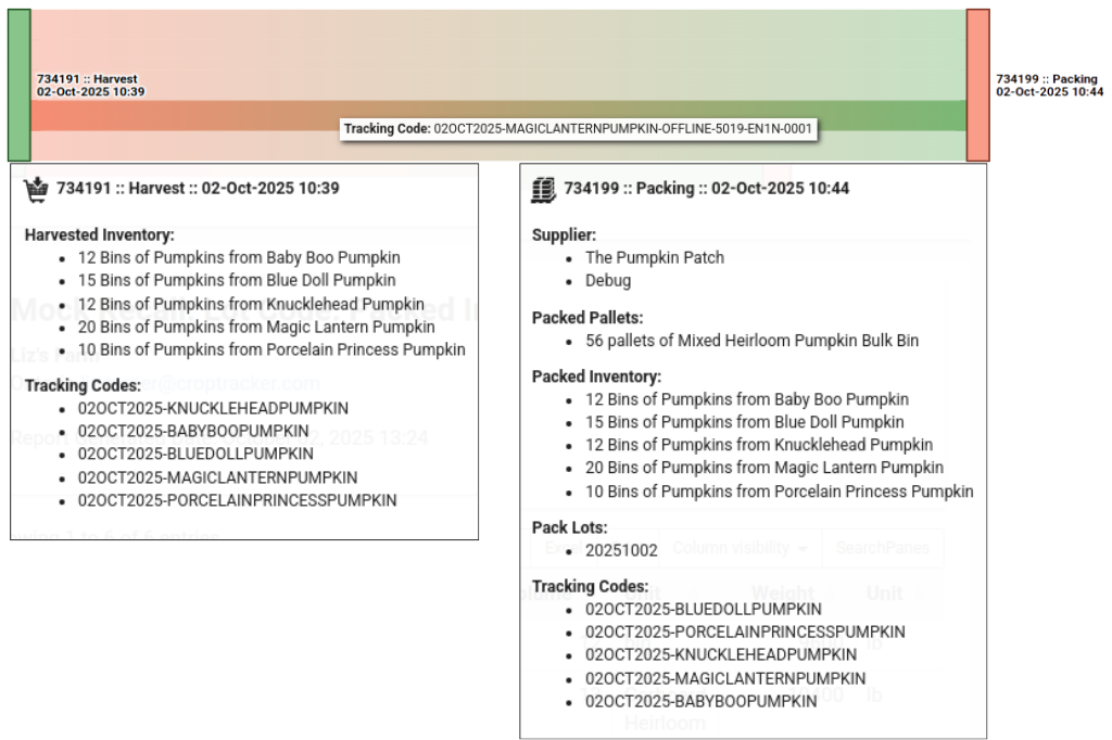 To ensure full traceability and accurate yield records, all the harvested inventory created today will be added to the packing event. This will create an inventory trail that is easy to follow through Croptracker reporting, satisfying auditor and customer information sharing requirements. Below is a section of Croptracker’s Mock Recall report which can be used to visually trace pack lots back to their origin (and forward through Storage and Shipping when recorded). This report will display the details of the harvested inventory as well as the packed product output.